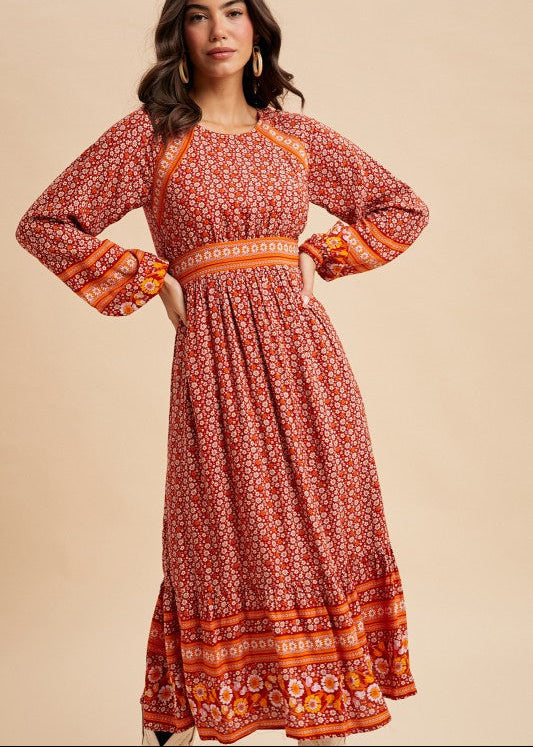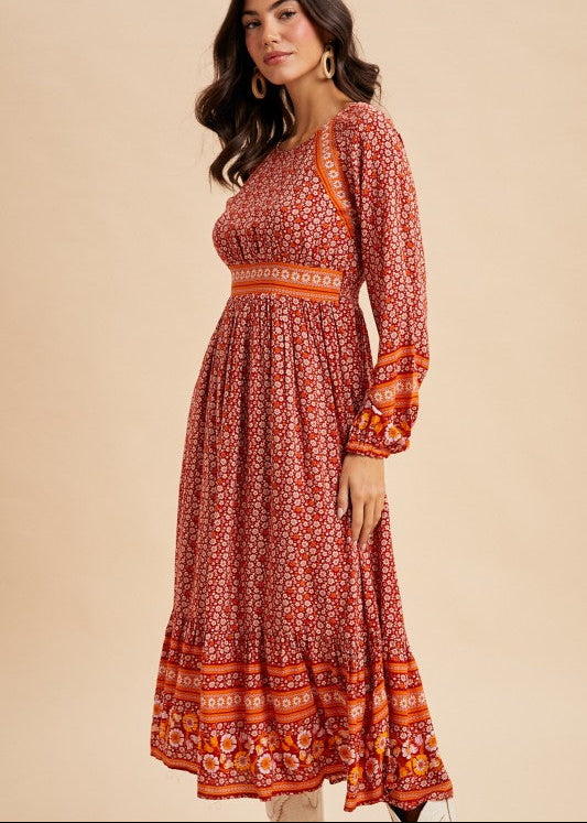 Embrace effortless elegance with this boho midi dress, featuring an enchanting floral border print that frames the silhouette beautifully. The flowing fabric drapes with graceful movement, while the midi length offers versatile styling for both casual outings and refined occasions. Perfect for those who appreciate bohemian aesthetics with a polished edge, this piece transitions seamlessly from day to evening wear.