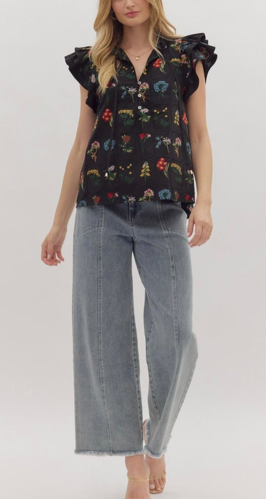 This Floral Embroidered Flutter Sleeve Top brings fresh charm with its delicate tiered flutter sleeves and a stylish piped split neckline. The button-front detail adds a touch of vintage-inspired elegance, making it a perfect choice for sunny days and casual outings. Its light and breezy design ensures comfort while showcasing a feminine, optimistic vibe.