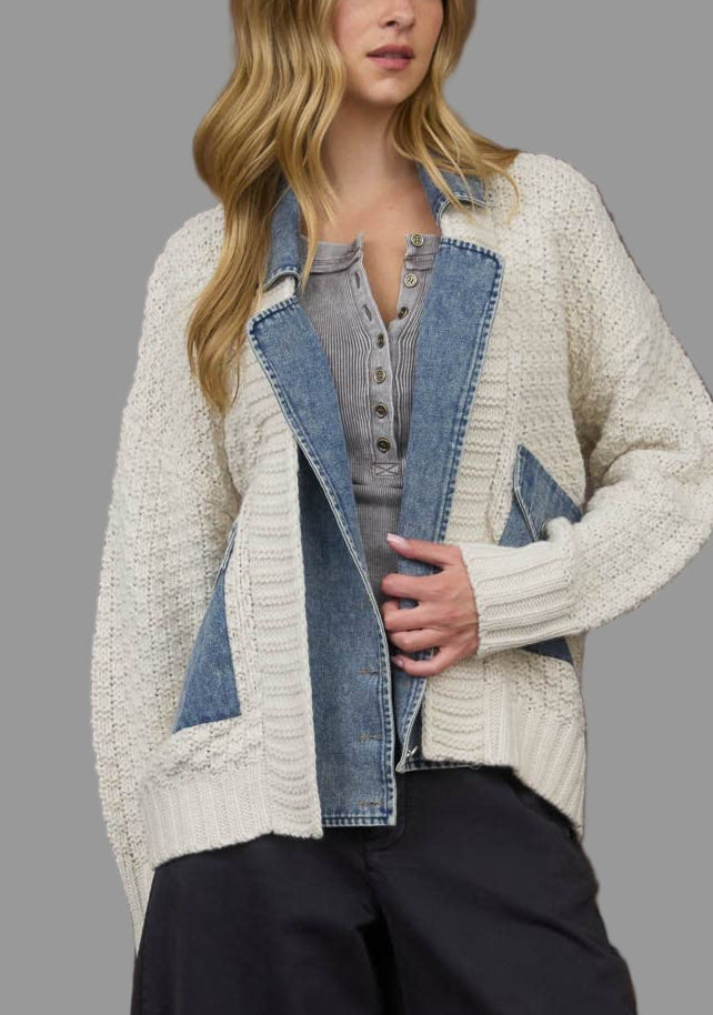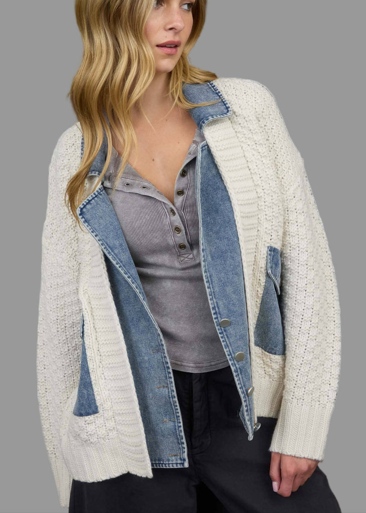 Embrace effortless style with the Mixed Media Cable Knit Denim Trim Jacket. This unique jacket combines cozy cable knit fabric with classic denim trim, offering a fresh, versatile look perfect for layering. Its soft texture and structured design keep you comfortable and chic on cooler days, making it an ideal addition to your wardrobe for a stylish, optimistic vibe.