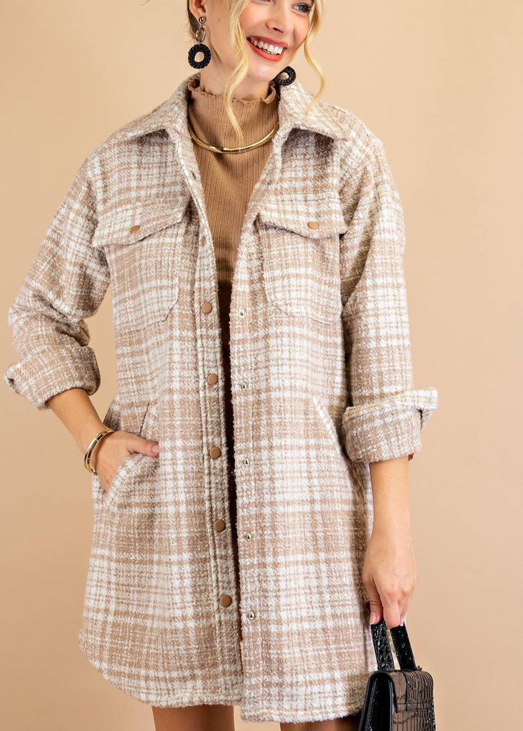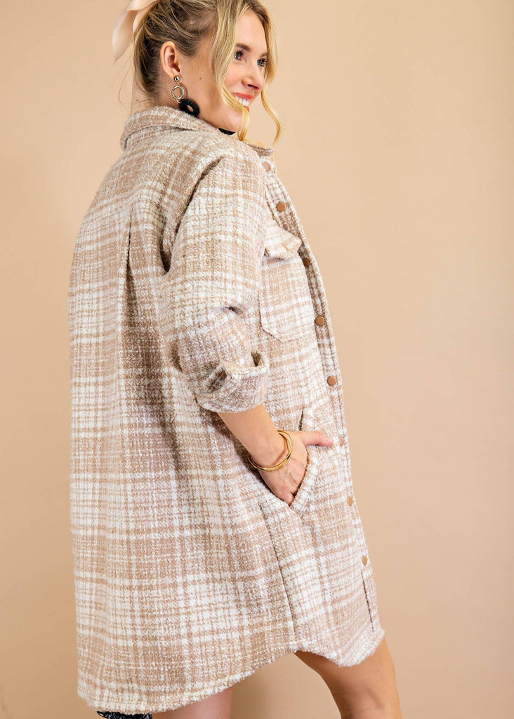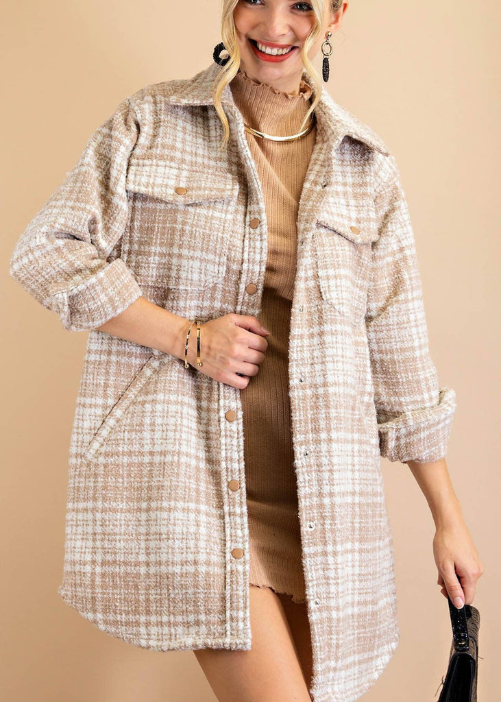 This Textured Plaid Jacket in Taupe is the perfect addition to any wardrobe. The unique texture and plaid pattern lend a fashion-forward touch to this classic jacket. Made with quality materials, it offers both style and durability. Elevate your look with this must-have piece.
