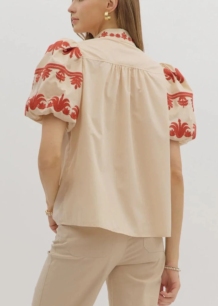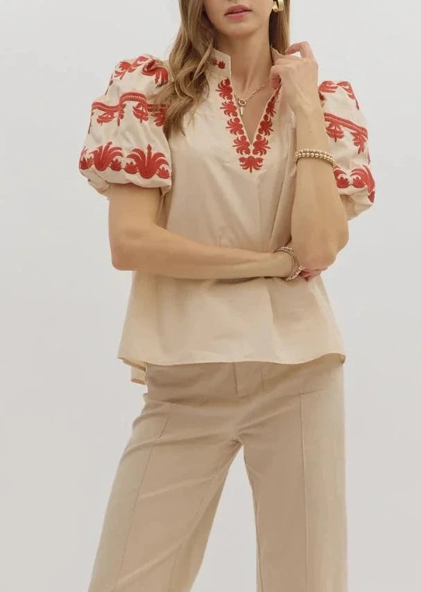 Elevate your wardrobe with this charming Embroidered Puff Sleeve Top, where vintage-inspired details meet modern style. The voluminous puff sleeves create an instantly flattering silhouette while delicate embroidery adds artisanal character and visual interest. Perfect for dressing up casual outfits or layering under jackets, this versatile piece transitions seamlessly from day to night. The thoughtful sleeve design frames your shoulders beautifully, making it an essential addition for anyone seeking effortless elegance with personality.