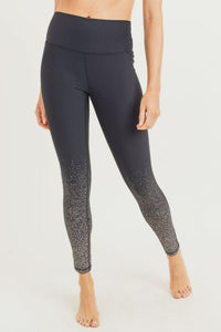 Our Metallic raindrop foil high waist Black leggings will jazz up any workout! They are constructed from solid colored four-way stretch fabric and decorated with dots and foil on the lower leg that starts sparse and gradually becomes dense. Did we mention the tummy control?!