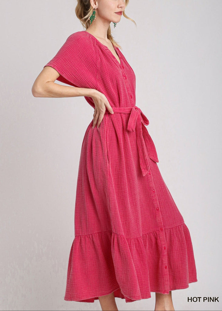 Effortlessly chic and undeniably versatile, this mineral washed button-down midi dress combines timeless style with modern comfort. The soft pink hue flatters every complexion, while the relaxed mineral wash adds character and dimension. Classic button-front detailing allows you to dress it up or down—wear it buttoned for a polished look or open over a tee for casual weekend vibes. The midi length hits at just the right spot for a sophisticated silhouette that works from office to dinner. Perfect for anyone seeking a wardrobe staple that transitions seamlessly through seasons and occasions.